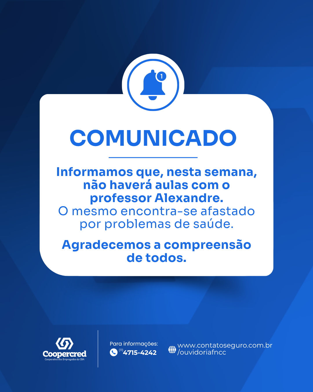 Contamos com a compreensão de todos e desejamos uma boa recuperação ao professor. 🙏