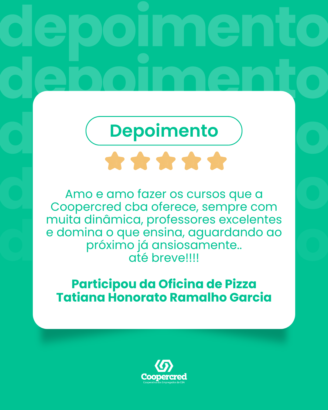 A cooperada Tatiana Honorato Ramalho Garcia participou da Oficina de Pizza e destacou o quanto gosta dos cursos oferecidos pela cooperativa, sempre com muita dinâmica e professores preparados que dominam o que ensinam. 🍕✨